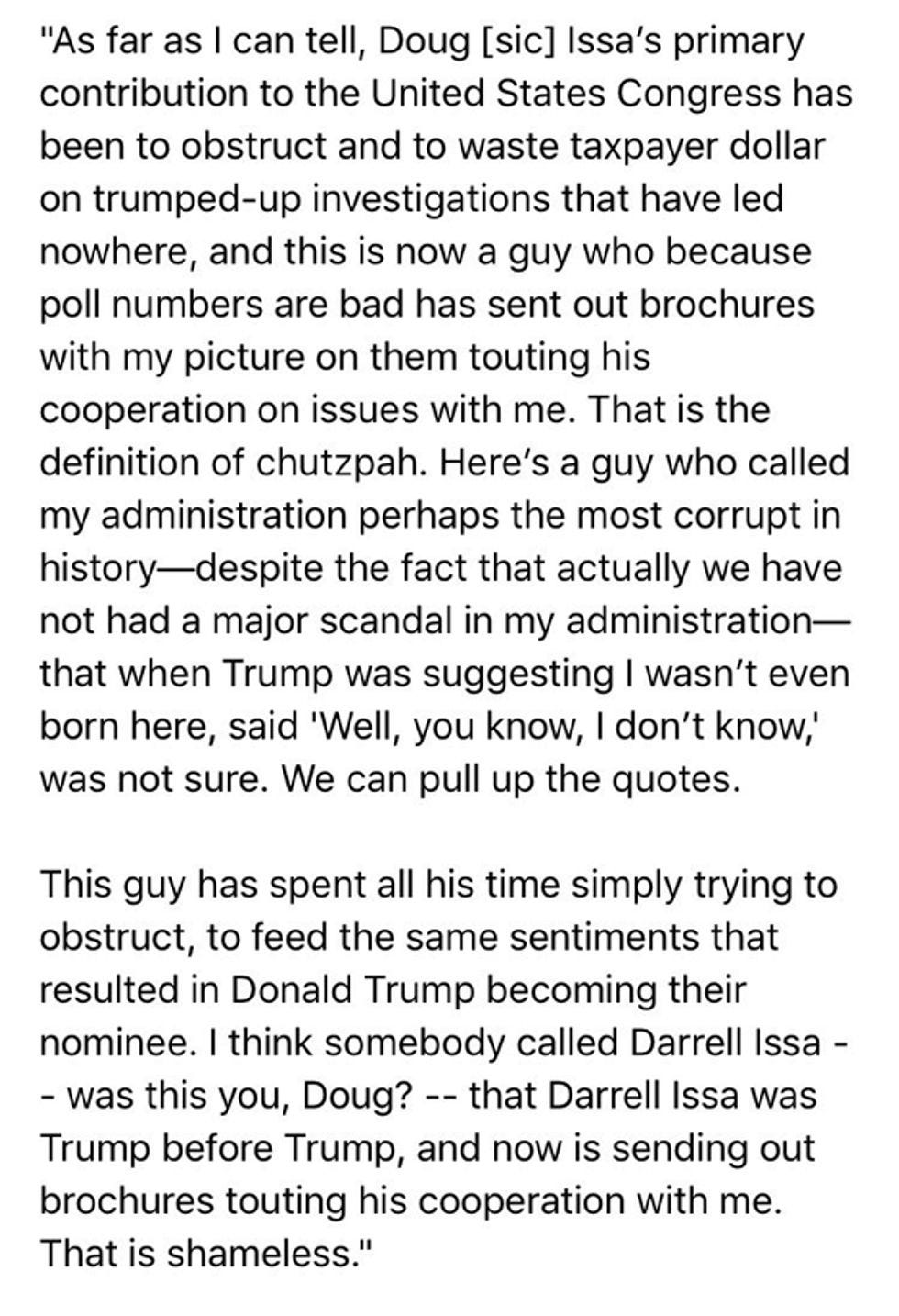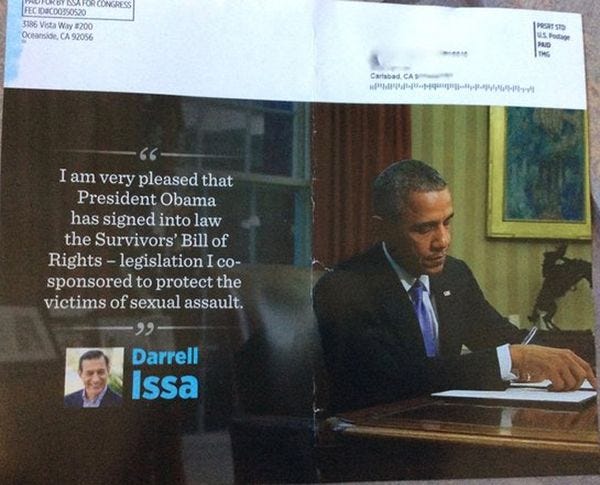 How desperate is Issa to try to hold on to his House seat? How about sending out a campaign mailerproudly featuring a photo of Barack Obama signing something (maybe a bill Issa sponsored, but maybe not) and praising Obama for signing Issa's bill. Seems pretty desperate for a guy who called the Obama Administration the "most corrupt in history," we'd say. Also a guy who held endless hearings on the horrors of Obamacare (and systematicallyexcluded people who'd been helped by it). A guy who blamed Barack Obama for the Republican shutdown of the government in 2013. So putting Obama's photo on a campaign mailer seems rather larcenous, you might say.