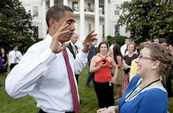 The Official White House Caption on this shocking Pete Souza photo reads, "President Barack Obama jokingly reacts to news that staffer Nora Becker will be leaving to pursue a joint MD and PhD in healthcare economics during the White House staff picnic on the South Lawn, June 26, 2009." Eh, looks to us like he's just cold lungin' for two handfuls of Smarty McCollegey. [ White House Flickr/Pete Souza ]