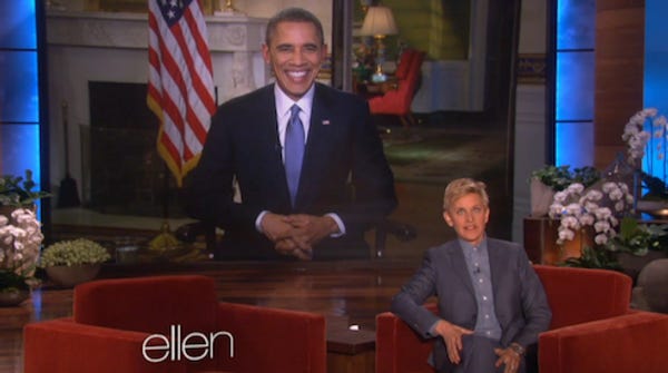 Your president of these here United States Barack Obama visited the Ellen show today via remote, which meant that his picture weirdly floated above Ellen, twice her size, which he probably demanded because of how he is such a megalomaniac even though he is also too a weakling. Anyway, Bamz just came on Ellen togay ram socialism down the throats of Americatalk about selfies, the Gap, and China.