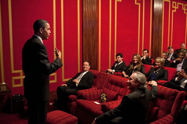 While our country is falling apart and the cretins are terrorizing the old and the sickly, here's your president Barack Obama with a bunch of ...movie directors. Jesus, this guy. What next, having Spielberg showE.T.to Reagan in the White House? Anyway, this scene looks familiar ....