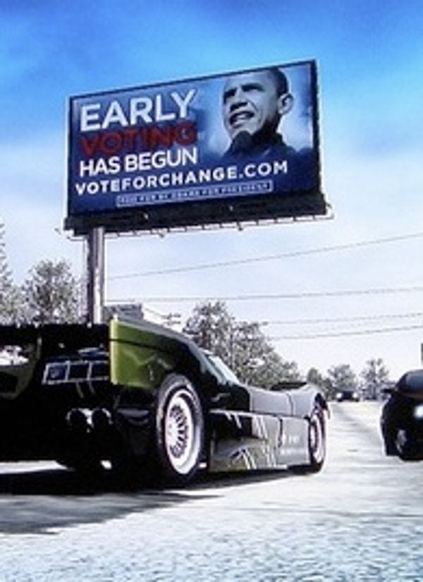 Some stoners were playing this video game calledBurnout Paradise(of course), and they noticed a funny billboard in the video game. Yes, that's your Barack Obama, telling the Xbox crowd about how people sometimes vote, for candidates, in these things called elections. But there is no way to actually vote within the video game, YET. Maybe next time! [ Jalopnik ]