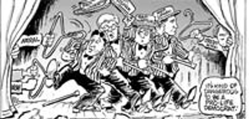 Ha ha, except before you get to your Obaman dessert, you've got to eat your vegetables -- specifically, your abortion vegetables. Check it out, all the pro-life Democrats have formed some kind of old-timey barbershop quartet. They're touring vaudeville stages all across the nation, singing in tunes in delightful four-part harmony about how that cluster of cells clinging to your uterine walls is just as much a citizen as you are! The sinister abortion lobby tried and failed to use the absence of these fetus-protecting heroes from the halls of Congress to extend the legal definition of fetal viability to the beginning of the 220th trimester. Ironically, this just made things worse for our anti-abortion tunesmiths, and they soon found themselves the victims of a medically unsupervised back alley/on-stage abortion.