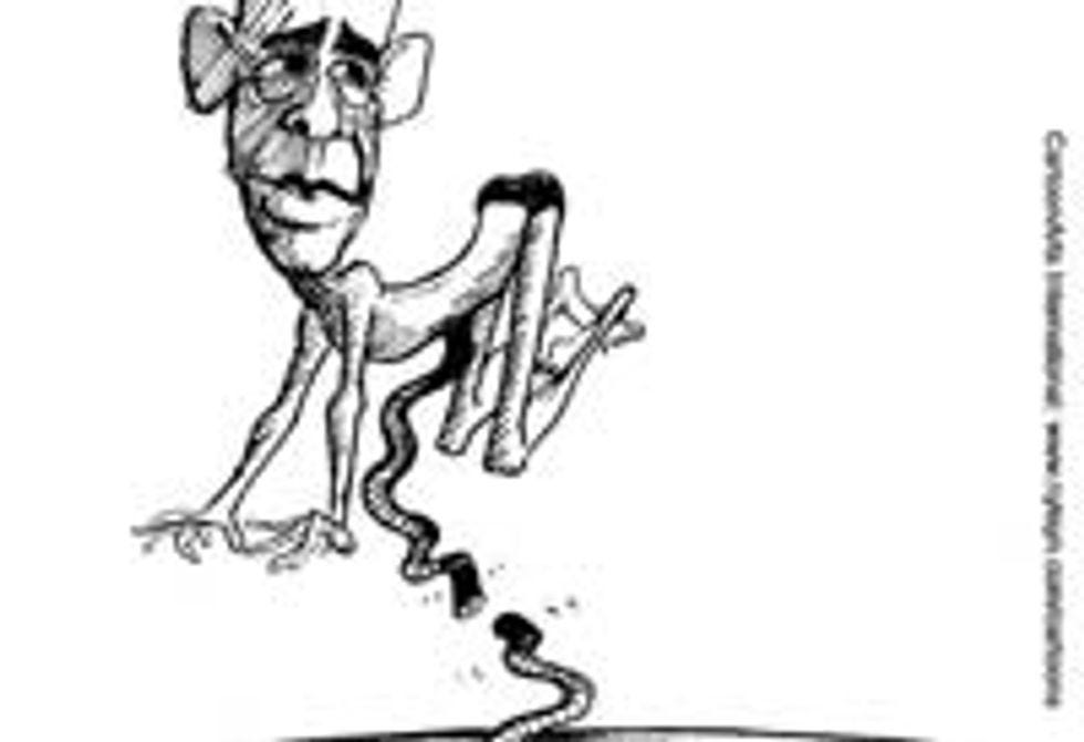 Which is not to say that the experience is a comfortable one for our gallant leader! As you can see, as a reaction to the trauma, one of his testicles has ballooned to an unnatural size. While this will help cushion him as he plummets through the Earth's atmosphere back to the surface, it will take quite some weeks for the swelling to subside, weeks during which diplomatic visits with foreign leaders are sure to be awkward.