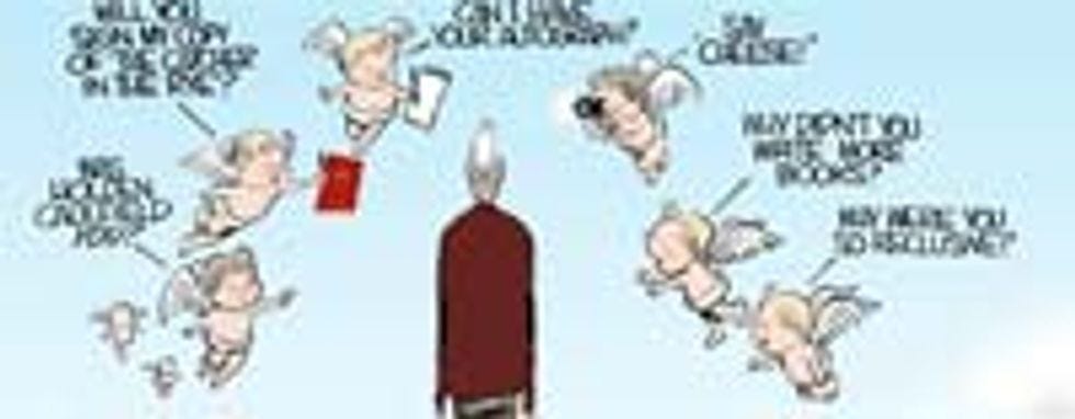 Meanwhile, back in space -- or, more specifically, in the afterlife, which scientists have proven to take place in space -- J.D. Salinger was harassed by a vicious swarm of cherubs, who turn out to be assholes! Ha ha, you think you can escape irritation even in death? Not with God's adorable little dickheads there to make eternity terrible!