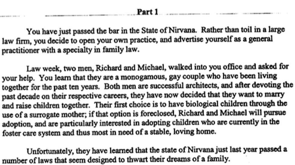 So this, this is a "real-world" scenario to Barack Obama: you are sitting in your law professor's office in the hippie state of "Nirvana" and every week or so these two homosexuals walk into your office for an orgy, during which they offer to buy your children. This is not law. This is just nonsense. For these paragraphs, Barack Obama gets a B, for "black," which he is.