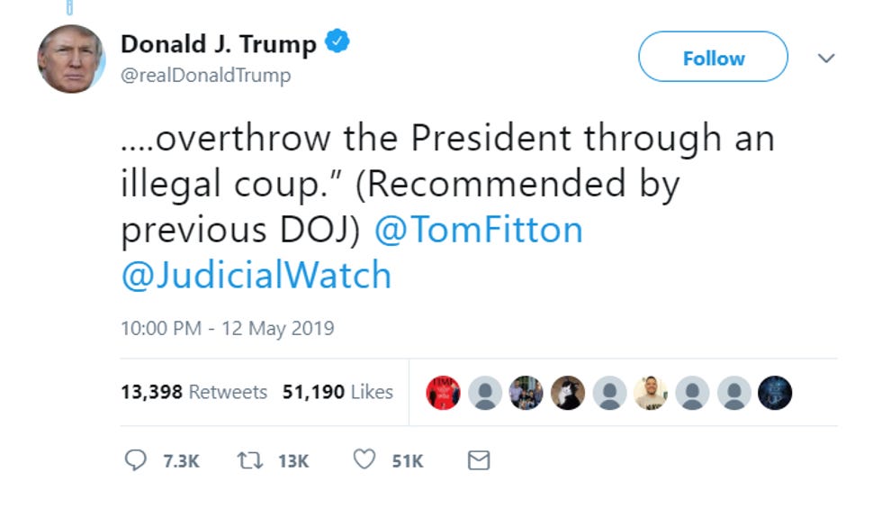 "The FBI has no leadership. The Director is protecting the same gang that tried to overthrow the President through an illegal coup." (Not a paraphrase.)