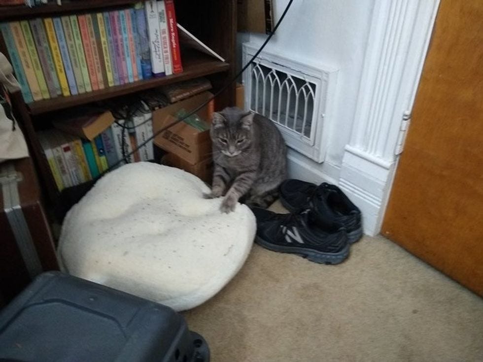 People replied with a lot of suggestions, like maybe letting the bed outgas for a few days in the garage, which in my case I have not got, or sprinkling some catnip on the bed, or folding back the "cave" part. The catnip at least went over well, and now Thornton kneads happily away on the bed. Will he lie on it? Heck no!