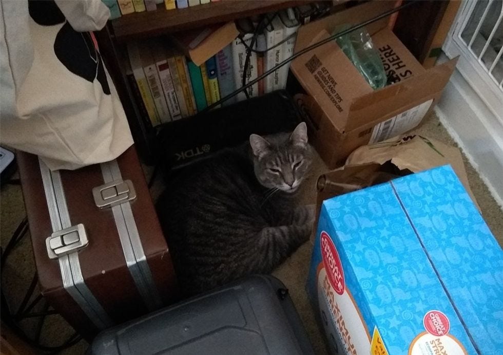 For instance, my cat Thornton (he arrived with the name, we don't know whether his prior owner was a fan of the playwright or not). A few weeks back, I noticed that Thornton had responded to the heat being turned on in my building by curling up on the one bare patch of carpet near the heating vent. Pardon the clutter; I DID get the glass recycling out to the bin not long after.