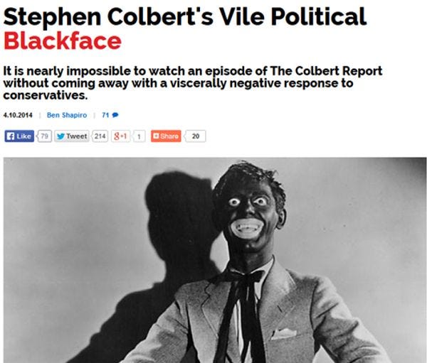 America, feculent dastardling Ben Shapiro is offended. He is very offended. His dudgeon is, in fact, quite high indeed. You see, he realized something yesterday in all the fuss over the announcement that Stephen Colbert would replace David Letterman as host of CBS's The Late Show: Liberals get all offended by blackface, which is a performance style characterized by broad, exaggerated, stereotypes of The Blacks. (By the way, The Blacks shouldn't be offended when white fratboys do blackface, becauseit is just a joke, and the good blacks have no truck with the grievance industry.) And yet, no one seems to be offended by the fact that for years now, Stephen Colbert has been doing exactly the same thing by pretending to be a character based on broad, exaggerated stereotypes of Conservatives. Is this not hypocrisy of the worst sort?