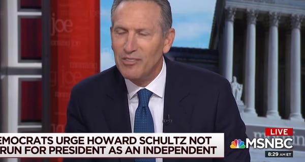 OK, we did not come to give that fucker attention, we came to tell you about just how shitty the internal polling is on a Howard Schultz candidacy, and also to tell you that SURPRISE, at this point, if he actually did mount an independent run, financed by his "people of means" spare change, he would A) lose like a motherfucker and B) likely hand the election to Donald Trump. (Which may be what he wants, let's be honest here.)