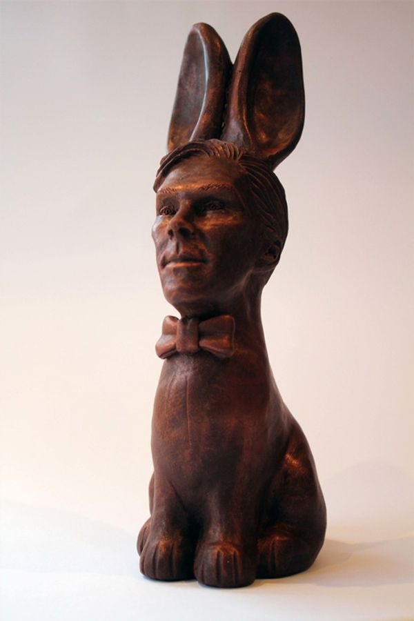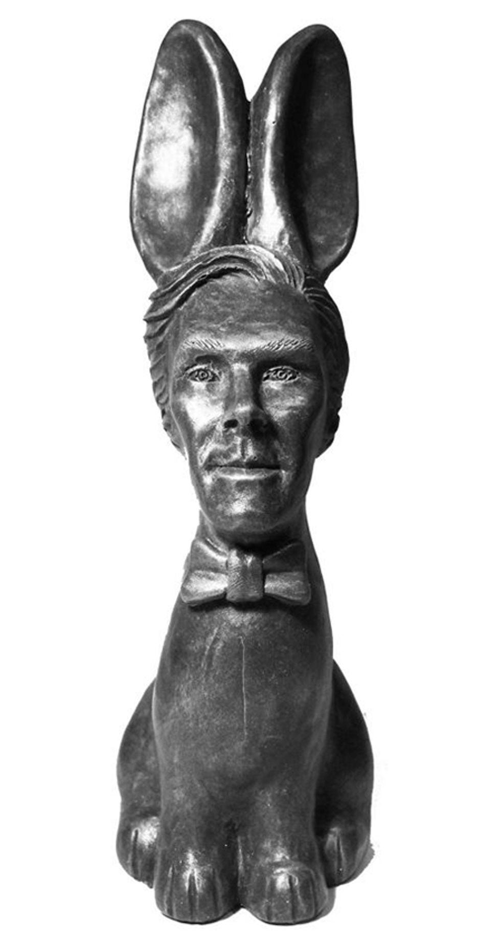 From the deranged or brilliant mind of UK food arteest Jen Lindsey-Clark, we bring you the Cumberbunny, a ridiculous chocolate bunny with the face -- unlicensed, we assume -- of Sherlockstar Benedict Cumberbatch. Don't ask why. Don't give too much thought to the sheer stupidity of a £50 (roughly $70) Easter bunny in a world where children are going hungry, for that is not the point of Art. Instead, accept it as far less horrifying than the existence of a $1,000 sundae and prepare for the Revolution anyway. The Cumberbunny is a thing, so you may as well wonder at the existence of a confection described by its maker as "a delicious Belgian chocolate rabbit with a handsome face and a tasty bottom."