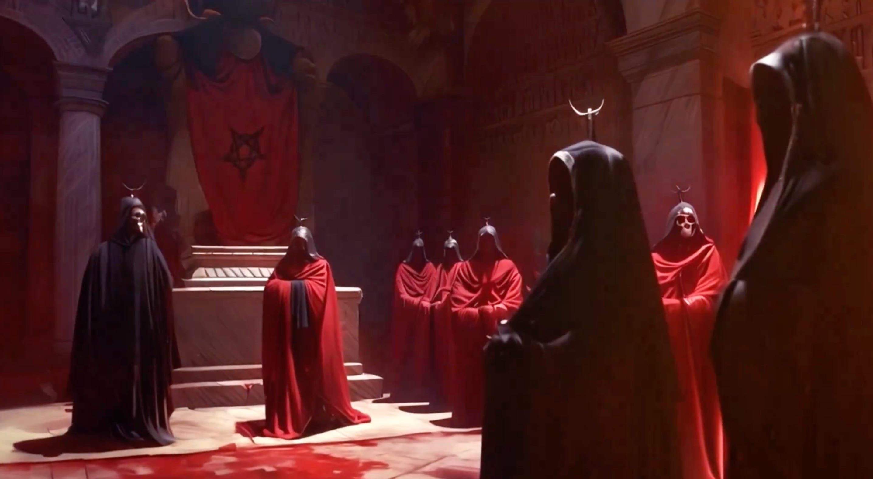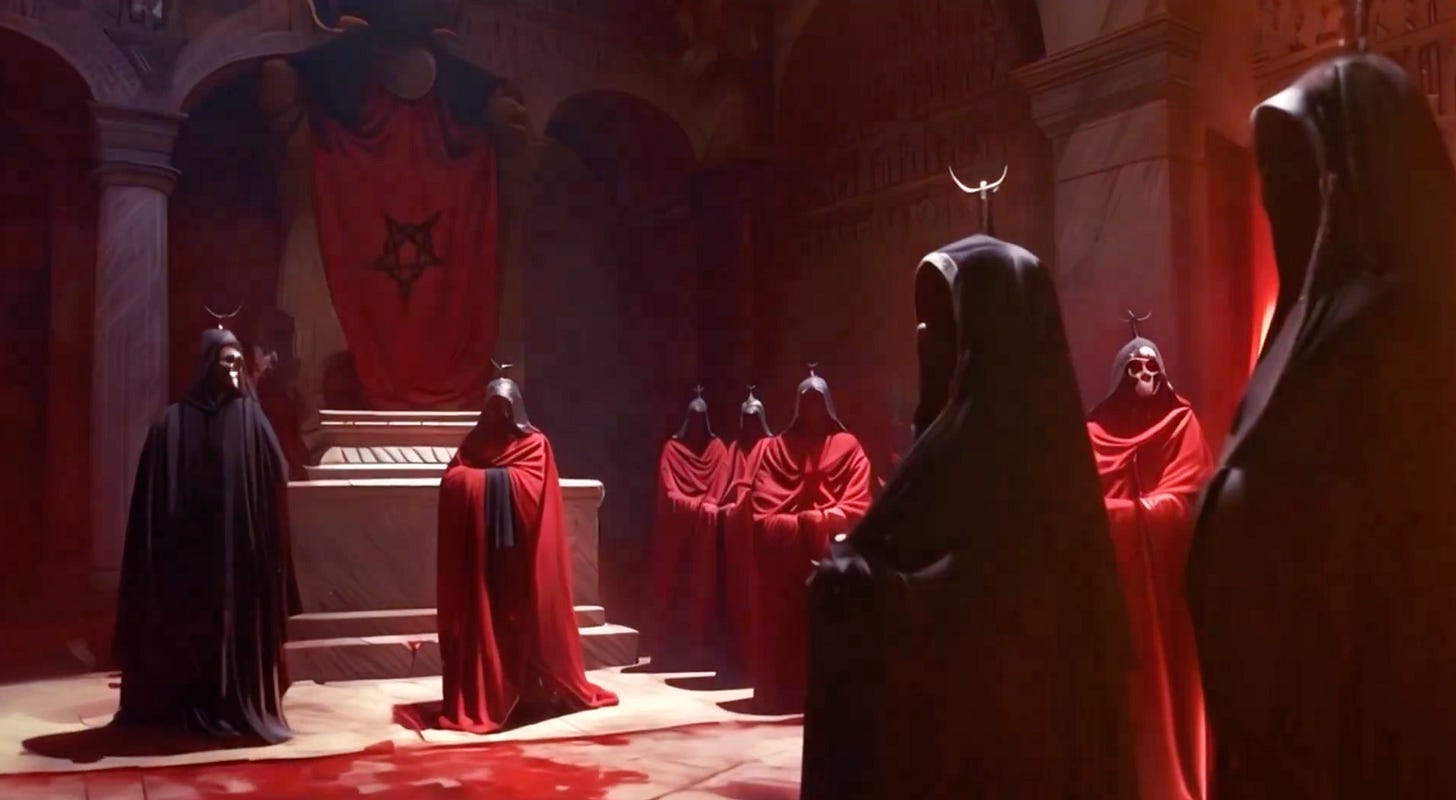 Satanists hanging out in cloaks on a bloody floor — just as voice-over guy says, “they have existed throughout time!”