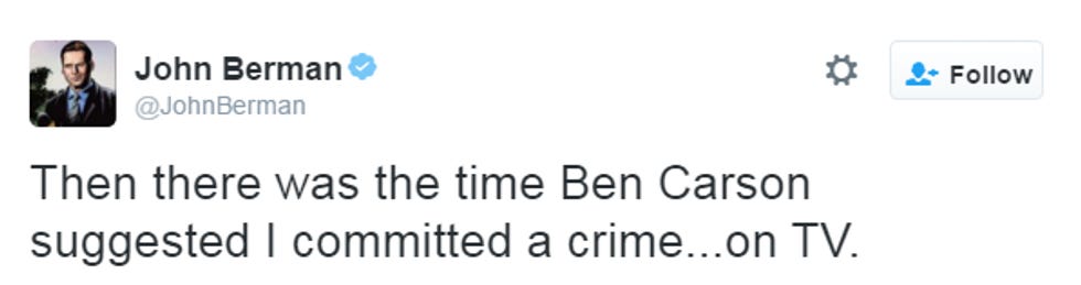 And then the following moment happened, which was glorious. Here is a screengrab of Berman like "Uh no, not me" while his co-anchor lady is like "ARE YOU A CRIMINAL?" and Ben Carson takes a quick nap:
