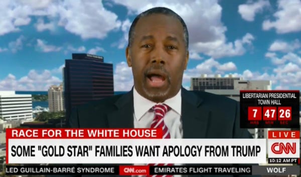 Hooray, Donald Trump's most narcoleptic shill has sleepwalked his way onto a television program to show us how broken his brain still is. Doctor Ben Carson The Brain Surgeon wishes this whole kerfuffle over Khizr and Ghazala Khan would just go away, and they would say sorry to Trump for being mean Muslims who lost their US Army captain son in an American war, and who say mean things about Donald Trump. He also wishes Trump would say sorry for ... unclear.