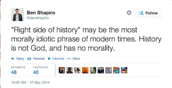 Whatcha doin'? Nothing much? Want to check out what baby-faced soon-to-be-unibrowed helium-voiced professional whine machine Ben Shapiro is up to? Of course you do! Today, Ben is very very sad that people keep using the phrase "the right side of history" because you keep using those words but Ben Shapiro does not think those words mean what you think they mean, because of God.