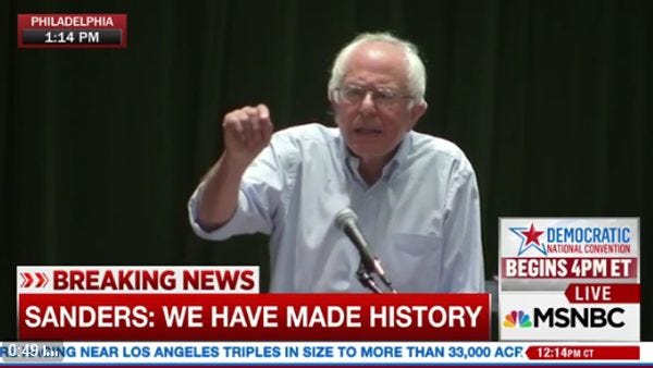 Sanders started out by congratulating his adoring throng, which is really the only kind of throng there is, congratulating them on a well-run campaign and saying all the nice things you say to supporters. "We showed you can run a successful national campaign without begging billionaires for donations." All without a super-PAC, and with average contributions of $27. He also touted the success of his supporters in pushing changes to the platform, and reducing the number of superdelegates for 2020 from 715 to 250. Woohoo! Not surprisingly, there were huge cheers for the resignation of Debbie Wasserman Schultz.