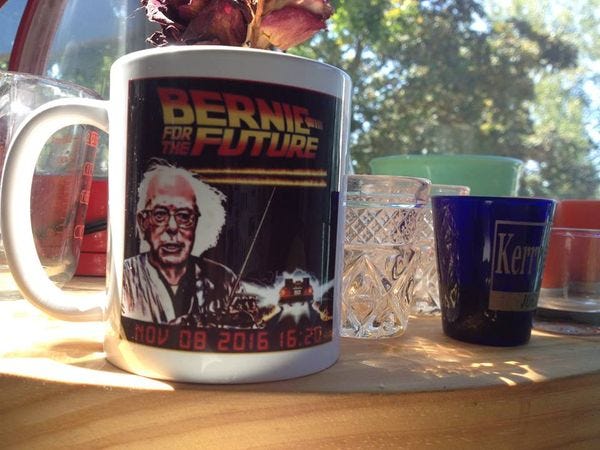 And yes, it's just one poll, and Bernie is from next-door Vermont, and the sample size -- 442 voters -- isn't necessarily the bestest ever. It's also August, when people are more likely to be wildly optimistic about outsider candidates who draw enormous crowds in cities full of progressives. And because it's August and we love our Bernie so much, we would just like to point out that we have these lovely Bernie Sanders Coffee Mugs, so you can tell the world, or at least your cat, that you have Bernie's Back for the Future while you sip your morning coffee. And don't forget the T-Shirts, too! Just don't spill coffee from your Bernie Mug onto your Bernie tee, or you may create a time paradox that not even Doc Brown could unscramble. Or a stain.