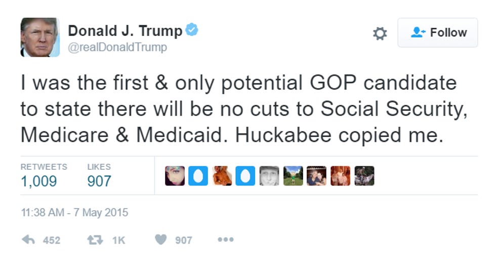 Bernie quoted that tweet, and another tweet, and other things that have come directly out of Trump's mouth hole on Medicare, Medicaid and Social Security, and then issued this challenge:
