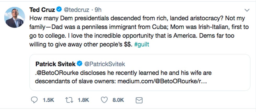 This doesn't even make sense. Every Republican president and nominee in our lifetime has been wealthy. Bill Clinton and Barack Obama were the true "American dream" success stories. Lobbing class warfare grenades at O'Rourke is petty even for Cruz. O'Rourke's willingness to own up to his past and use it as a motivation for good works isn't "hashtag guilt," it's leadership. That's something Trump's personal hemorrhoid cushion would never understand.