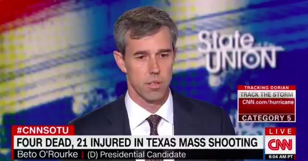 Look at Beto dropping an R-rated protest song on our asses! And although no woman candidate could everget away with such bluntness, he's 100 percent correct: This is fucked up. How else do you describe two mass shootings in the same state in the same month? Imagine Texas was a separate country: Suburban helicopter parents wouldn't let their teenage kids make bad decisions there during spring break. A 17-month-old child was shot in the goddamn face! If Marvin Gaye was alive, he wouldn't bother with "What's Going On," he'd go straight to "This Is Fucked Up, Y'all."