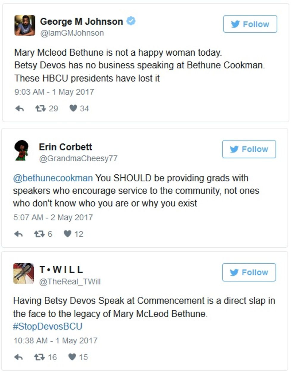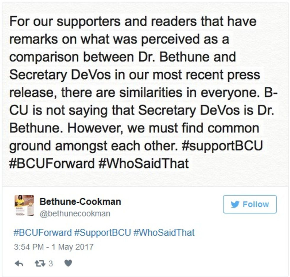 A Change.org petition posted Monday after the announcement, calling for a reconsideration of the invitation, had by late afternoon surpassed its 4500-signature goal. Instead of calling for DeVos to be turned away altogether, the petition asked that a new commencement speaker be invited and that, in the name of "engagement and open communication," Secretary DeVos instead be invited to some non-ceremonial event where the campus community could "welcome her to the table and have meaningful dialogue about stronger policies, the White House HBCU Initiative, and the importance and contributions of HBCUs."