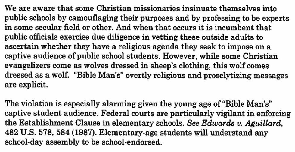 (Also, excuse us, reporter lady at 26 seconds in, it's not so much that the Bible Man's message is unconstitutional as that having it as part of the school day is. Yes, even if the heathen children eventually find out they're allowed to go do something else while the good kids get their souls saved.)