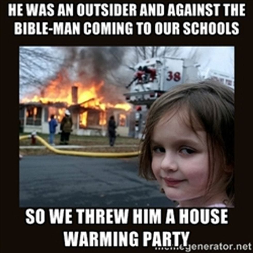 Shortly after receiving the letter, Grundy County schools promptly suspended school visits from the Bible Man, and of course the good citizens of the county were OUTRAGED, taking to Facebook with loving Christian warnings of retribution for the parent who put an end to their beloved Bible Man's school ministry, like this loving suggestion that maybe some arson was warranted (naw, not really, it is just a joke, dumb lady! OR IS IT? Haha, you won't know until it's too late!):