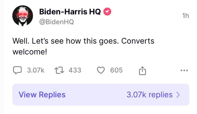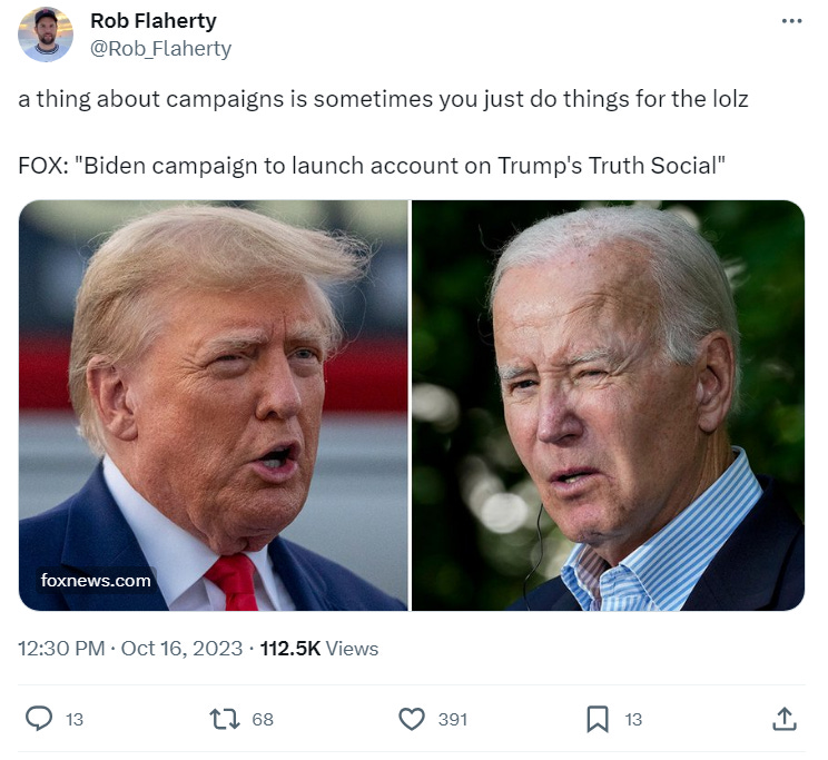 There is no part of this that isn’t trolling. This didn’t cost them money. There is not one inbred moron on Truth Social the Biden campaign is truly seeking out as a voter. But sure, converts welcome!