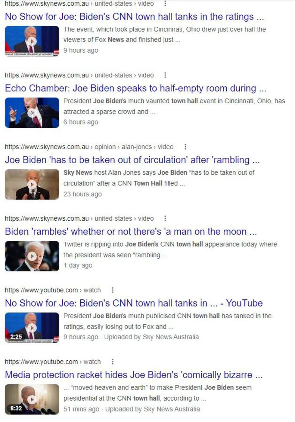 Joe Biden held a TV town hall on CNN Wednesday night, taking questions from CNN anchor Don Lemon and members of the audience in Cincinnati. It was pretty good, all in all, at least judging by the rightwing reaction: Fox News made a big dealout of the program's low ratings and ran multiple stories mocking it; Sean Hannity called it an "unmitigated disaster"; Tucker Carlson claimed it demonstrated"what disinformation looks like" ; and in case anyone needed more, Fox also ran aroundup of other righties slagging it. Weirdly, Rupert Murdoch's Sky News seems to have devoted even more video time than his US operation to telling Australians what a terrible fiasco the town hall was.