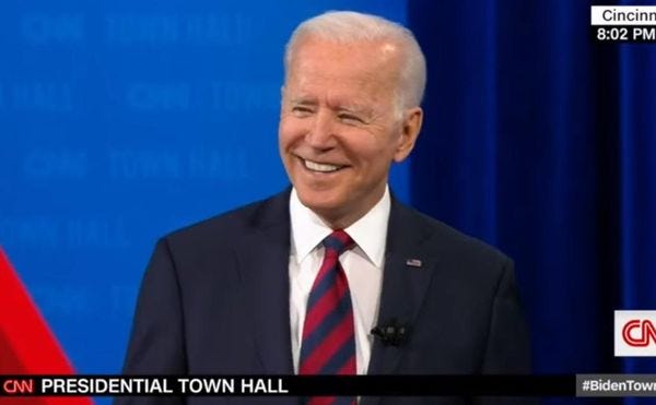 This suggests that Joe Biden's presidency is doing just fine. As for the town hall, it wasn't electrifying TV, and would have been a good 10 minutes shorter if you could magic away all the interjections of "I'm not kidding here" and "seriously, this is no joke," which we suspect Biden has adopted so he won't say "literally" so much. But that's a minor concern; on the whole, Biden repeated key points of his agenda and made a little bit of news.