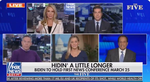 Perhaps sensing that they're going to faceplant into the pit they've dug for Biden, Fox News immediately shifted from “Biden won't give press conferences. What's wrong with him?" to “Biden has announced his press conference more than a week in advance. What's wrong with him?"