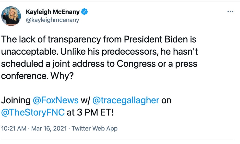 McEnany whined: “Unlike his predecessors, [Biden] hasn't scheduled a joint address to Congress or a press conference. Why?"