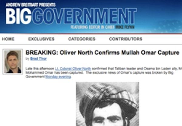 Ha ha ha, don't know how we missed this earlier in the week, but athriller novelistnamed Brad Thor has been publishing major major national security Scoops at Andrew Breitbart's Big Government joke blog: "Late this afternoon Lt. Colonel Oliver North confirmed that Taliban leader and Osama bin Laden ally, Mullah Mohammed Omar has been captured. The exclusive news of Omar’s capture was broken by Big Government Monday evening." Oh my god. "According to Colonel North, Omar was picked up in Karachi on March 27th by the Pakistani Inter-Services Intelligence Directorate (ISI) who placed him under house arrest in what they call 'community care.'" Sure, why not. Oliver North confirms to the trade paperback novelist at Andrew Breitbart's joke blog that Mullah Omar was captured a month and a half ago. Hmm... looking for possible holes here... eh, we give up. Fucking most valid scoop in history.