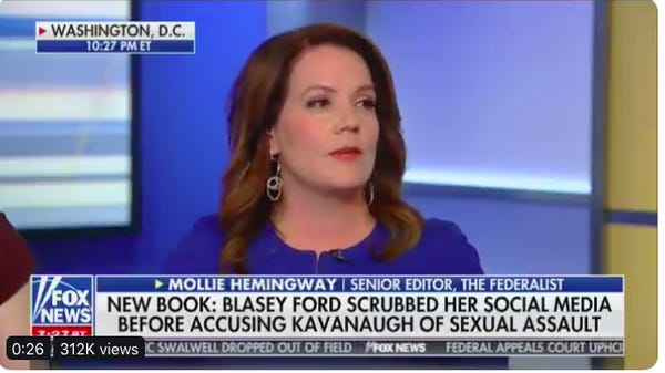 Mollie Hemingway says Christine Blasey Ford was "a heavy drinker who was much more aggressive with boys than we wer… https: //t.co/XoTFHL4Sen
