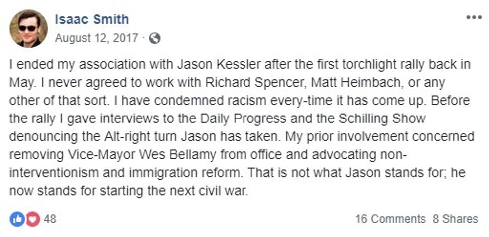 But wait! Isaac Smith says he cut ties with Kessler after the night of the tiki-torch waving Nazis in Charlottesville, because White Nationalism Bad!
