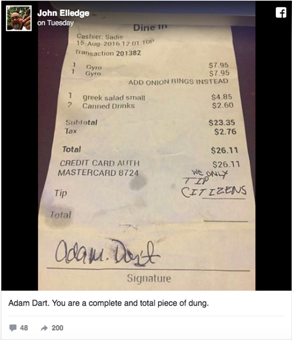 Furious at Karina, an American citizen, for taking a job from an American citizen, the Darts decided to vote with their dollar and refuse to tip her. And not only that, they wrote down their reasoning -- "We Only Tip CITIZENS" -- on the line normally reserved for the tip. So she would know they were onto her scheme, and promptlyleave America for another country that she is not a citizen of!