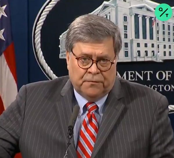 Reminder: This is the same Bill Barr who was absolutely willing just a couple of months ago to spread unmitigated horseshit about how China or some other foreign actor was just going to manufacture fake mail-in ballots for Joe Biden, based on the evidence he saw when he closed his eyes really tight and punched himself in the face repeatedly, allegedly .