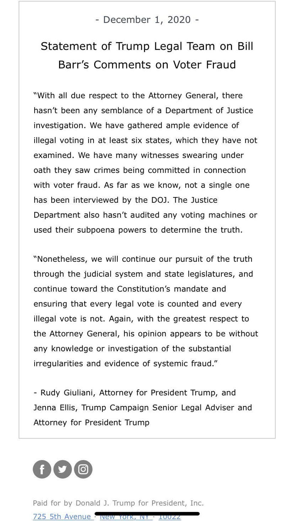 Also the Trump "legal team" has issued a statement about Barr's comments, and LOL THEY MAD: