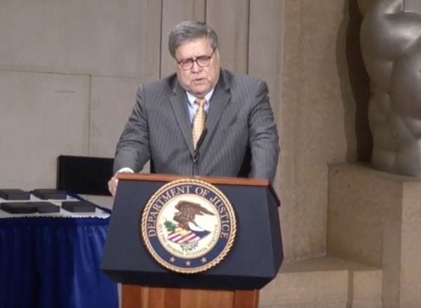 Huffpost notes that the Department OfBusting HeadsJustice "did not immediately respond" to a request for clarification of which "communities" Barr had in mind, or of "what he meant by people finding themselves without police protection." Gosh, it is indeed a mystery! Although Slate has a pretty good read on the meaning: Maybe it's like Barr's boss telling Ukraine it should investigate Joe Biden -- shame if something happened to those US anti-tank missiles.