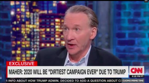 Just a few seconds earlier, Maher claimed the 2020 election would prove the "dirtiest campaign" ever. Trump will "swift boat" whoever his eventual opponent is. Meanwhile, Maher is shoveling shit on our last nominee. He's also normalizing Trump's gross abuse of power by even comparing it to Clinton's email server maintenance. It's not in the same fucking ball park. O. Henry couldn't match the irony of Maher lamenting that media disinformation might help re-elect Trump while glibly spreading false narratives.