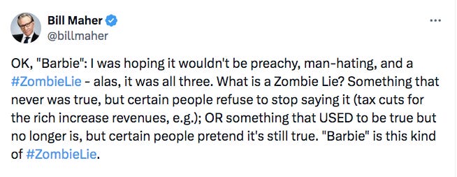 OK, "Barbie": I was hoping it wouldn't be preachy, man-hating, and a #ZombieLie - alas, it was all three. What is a Zombie Lie? Something that never was true, but certain people refuse to stop saying it (tax cuts for the rich increase revenues, e.g.); OR something that USED to be true but no longer is, but certain people pretend it's still true. "Barbie" is this kind of #ZombieLie.