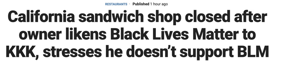 The KKK, the Mafia, and North Korea all kill people. Black Lives Matter is advocating against brutality and murder. Mann declared there'd be "no pins, no [tip] jars, no discussion of BLM in my store" and that his employees would "need to show appreciation and gratitude for my capitulation that you achieved." That sentence, while not entirely English, sounds more mobbed up than Black Lives Matter.