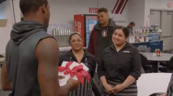 "For what you all do for us every day and never complain, I really appreciate you all, so I wanted to give my first game check to y'all to help y'all out in some type of way," Watson told the woman in a video shared by the Texans. "Here you guys go."