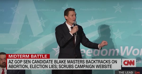 Arizona Senate polls are bleak for All-American Fascist Doll GOP candidate Blake Masters. Go to Real Clear Politics and pick a poll, any poll, and Masters is losing badly to Democratic incumbent Mark Kelly. Even reliably right-leaning Trafalgar — the Republican candidate’s favorite aunt of pollsters — has him down two points.