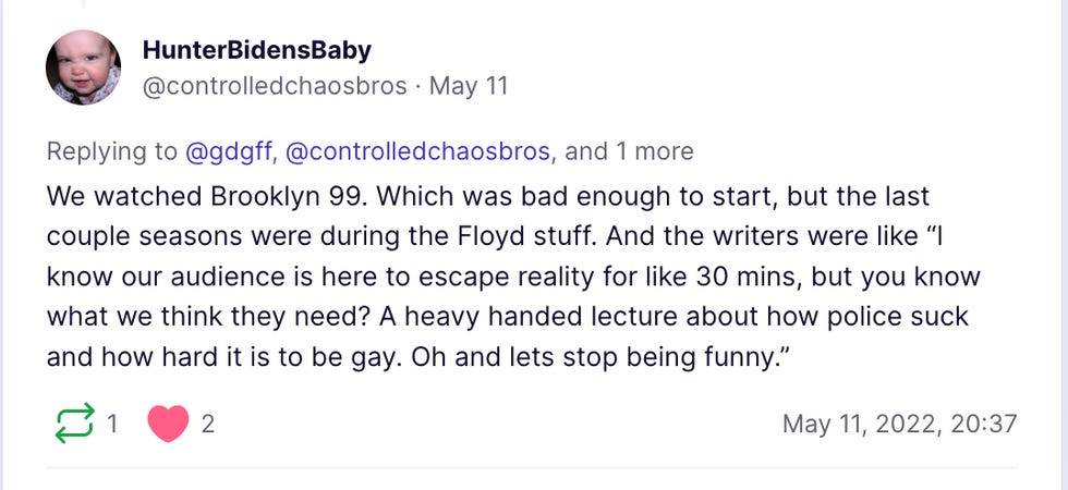 Stephen and I were discussing "Brooklyn 99" as copaganda in the chatcave and he noted that conservatives and actual cops probably hate the way the cops on the show are portrayed. And he was right! The only thing I could find on the show was people complaining about how it was "woke."