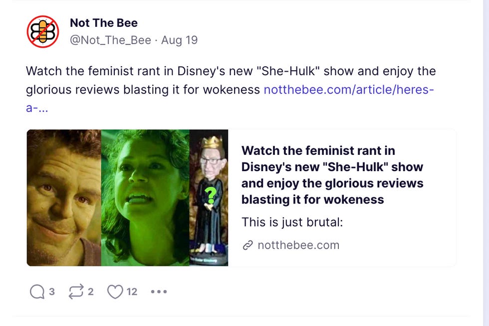 But according to Truth Social, everyone hates it and is mad about how "woke" it is, with the "Not The Bee" account encouraging users to "Watch the feminist rant in Disney's new 'She-Hulk' show and enjoy the glorious reviews blasting it for wokeness."