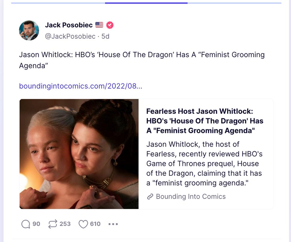 So surely — surely! — some people on Truth Social had to be "truthing" about something other than rightwing nonsense, right? After all, the site's tagline says that it is "America's 'Big Tent' social media platform that encourages an open, free, and honest global conversation without discriminating on the basis of political ideology." So I thought I would take a look and see what the Truthers were saying about popular culture. What they talked about when they weren't talking about Trump or conspiracy theories or how mad they are about how much everyone else seems to like civil rights (ie: "wokeness").