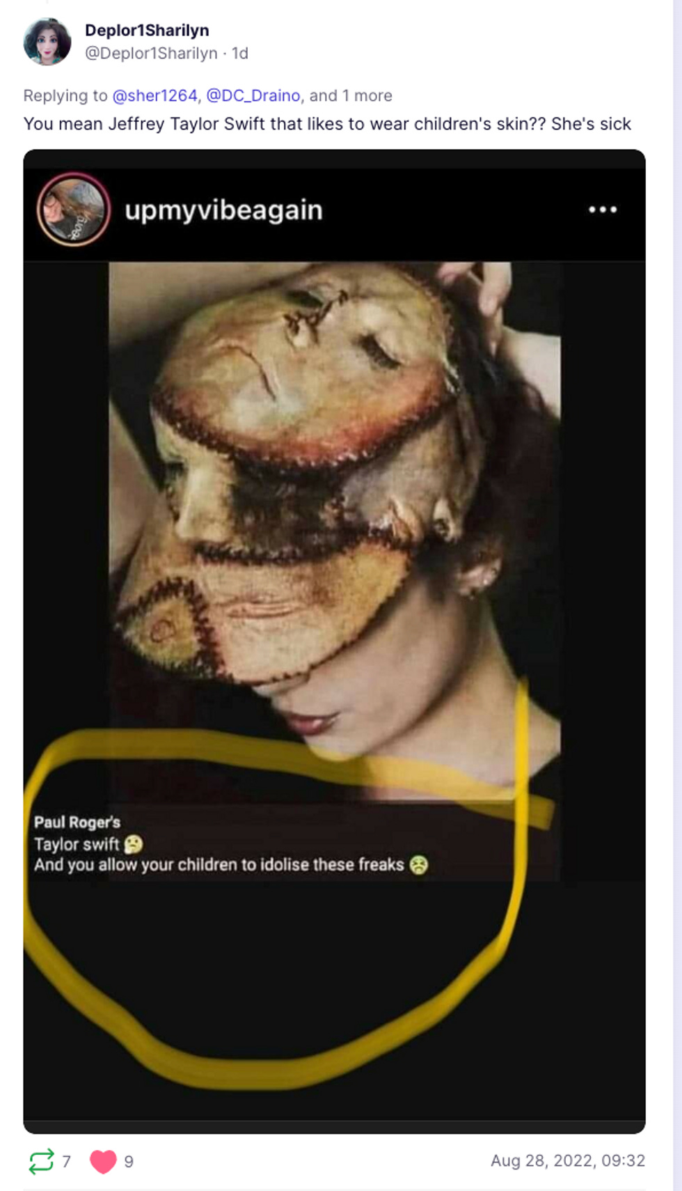 I'm not totally sure that's what she did, but boy, the bitterness was palpable! The best of the responses though came from this person who legitimately thought this picture of TaySwift wearing Ed Gein's hat was real.