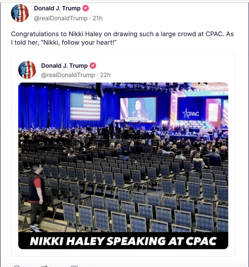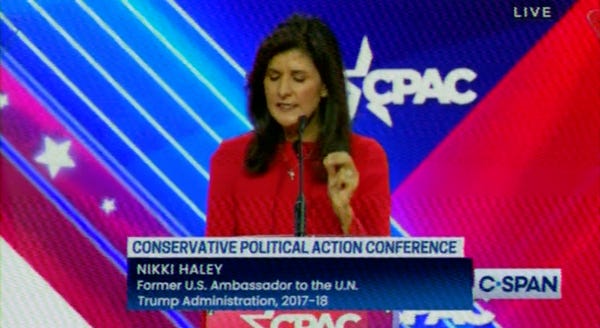 Haley took a reportedly "veiled shot" at Donald Trump when she said the party needed a "new generation of leadership" and asked, "Are you tired of losing?" Immediately after her speech, while taking selfies with CPAC attendees, Haley was surrounded by heckling Trump supporters who shouted at her, "We love Trump!" and "Trump! Trump! Trump!" and chased her in the elevator. She really connected with them.