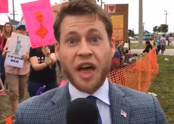 Meet Owen Shroyer, a young InfoWars dipshit who guest-hosted the Alex Jones program on Thursday, we guess because Jones was off getting his nipples waxed with molten Texas barbecue sauce. Usually, Shroyer is a man-on-the-street type "reporter," out there doing the thankless work of stickin' it to the liberals day in and day out. But not today! He's sittin' in the big chair like thebig boy he is .